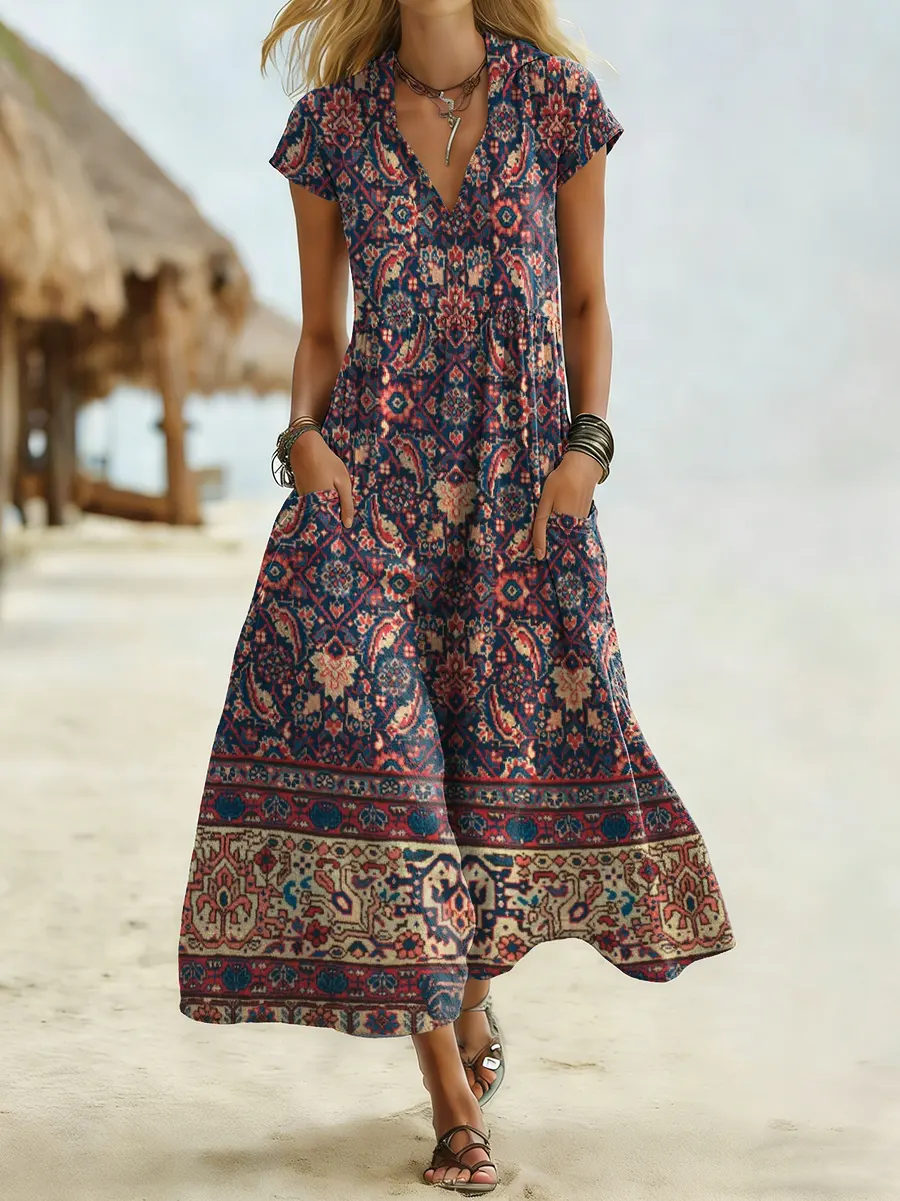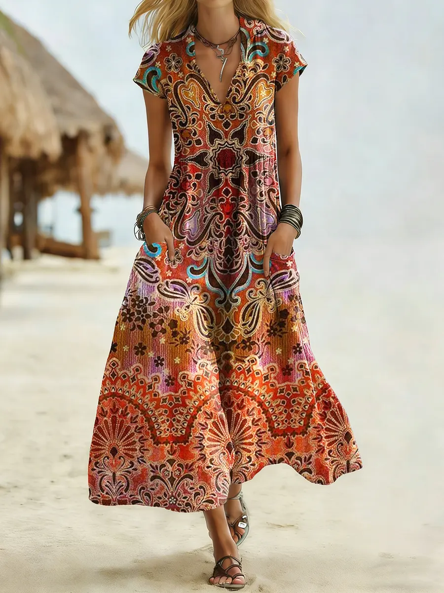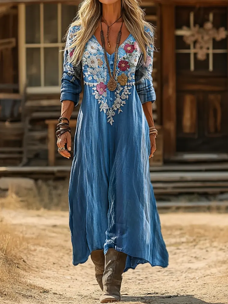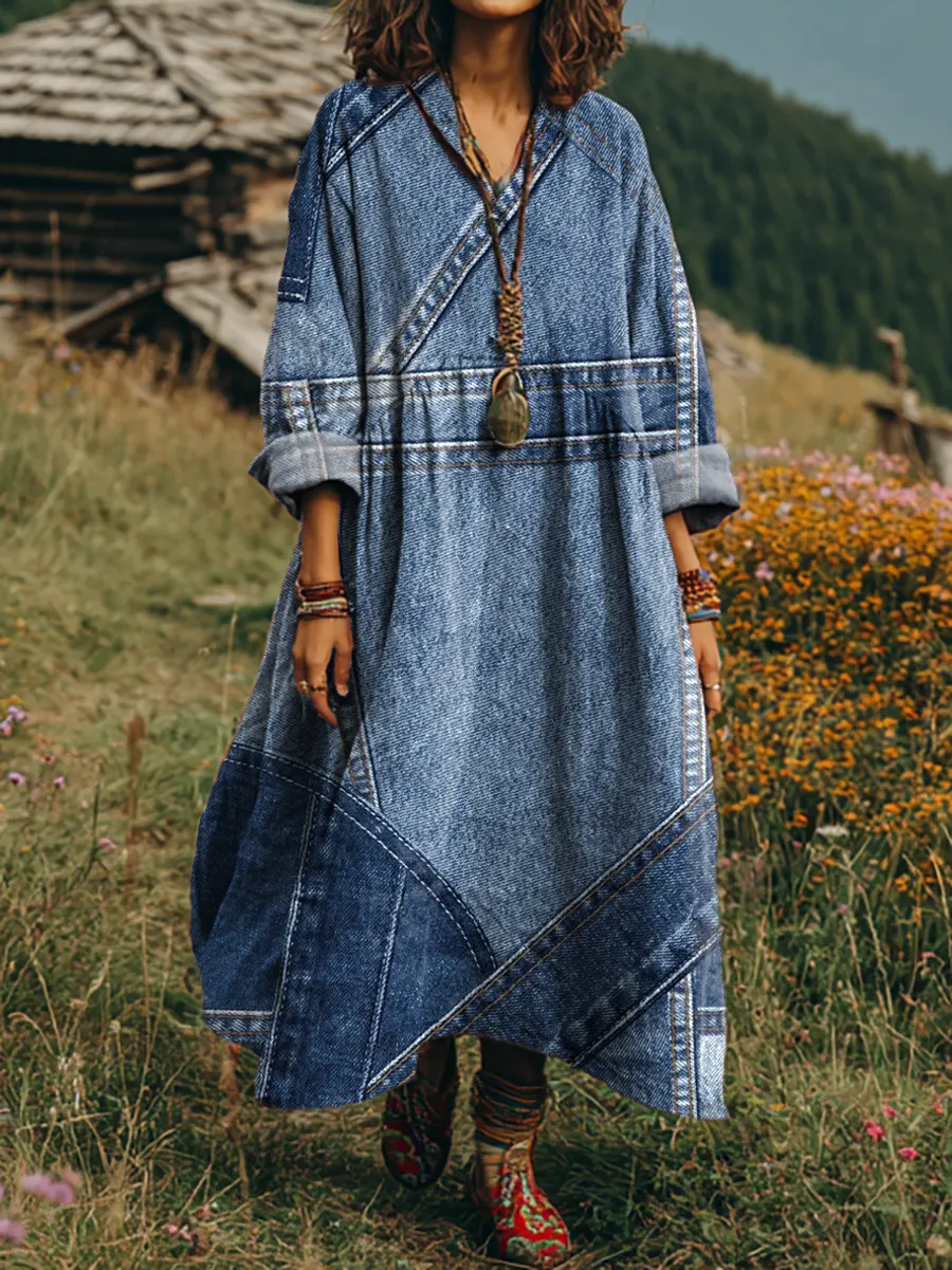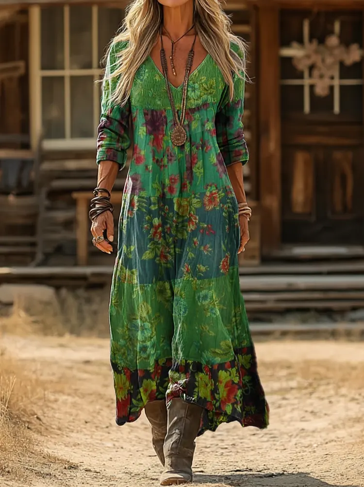 Women's Bohemian-style Long-sleeve V-neck Dress With Ethnic-inspired Artistic Print