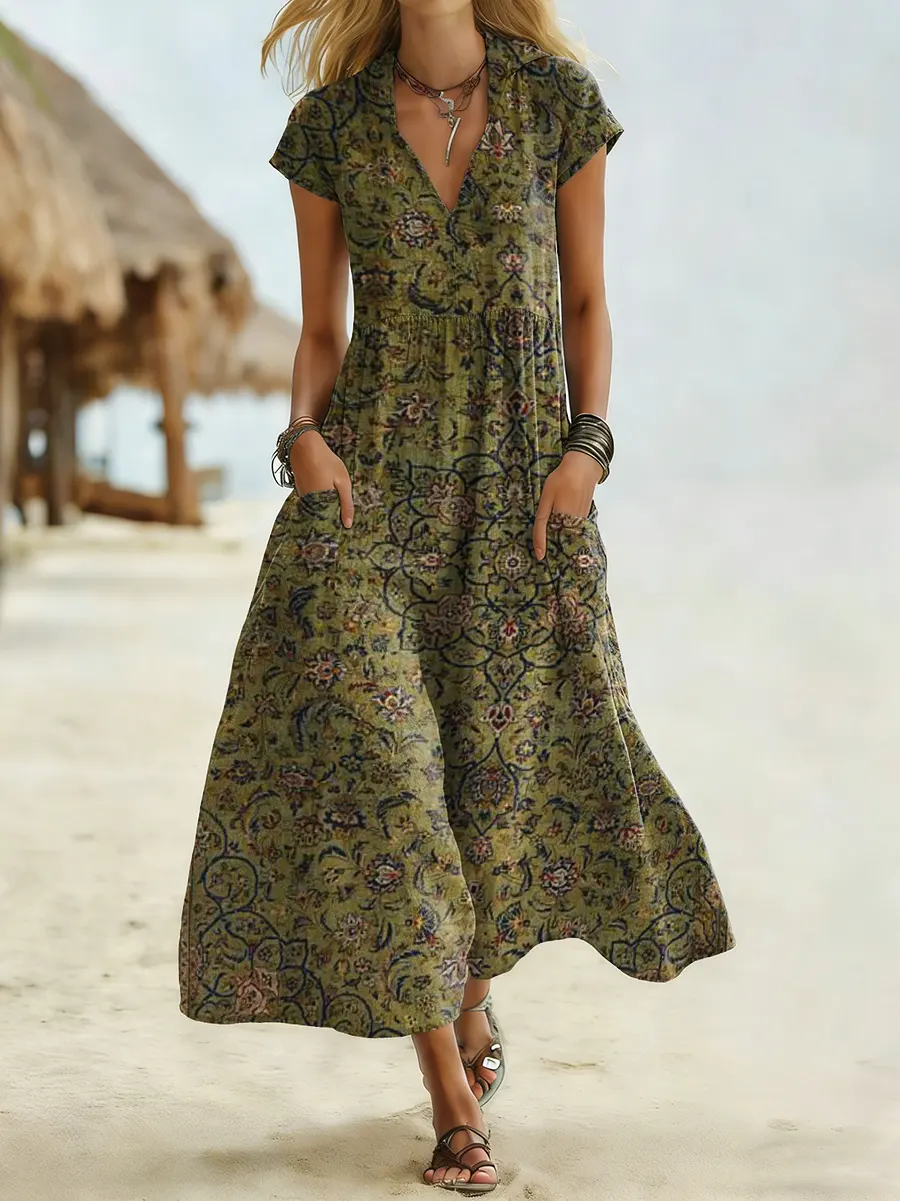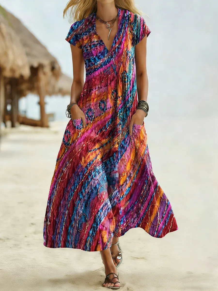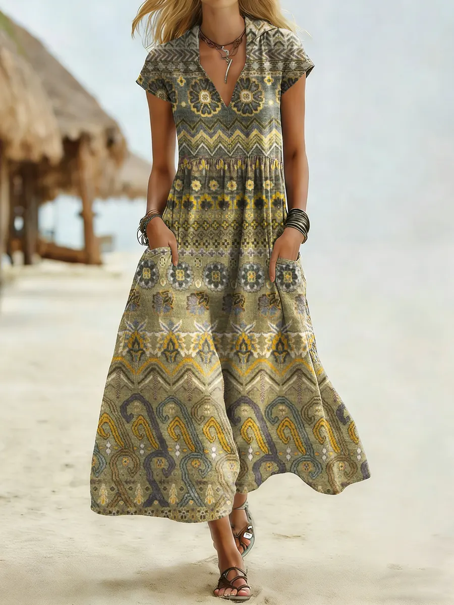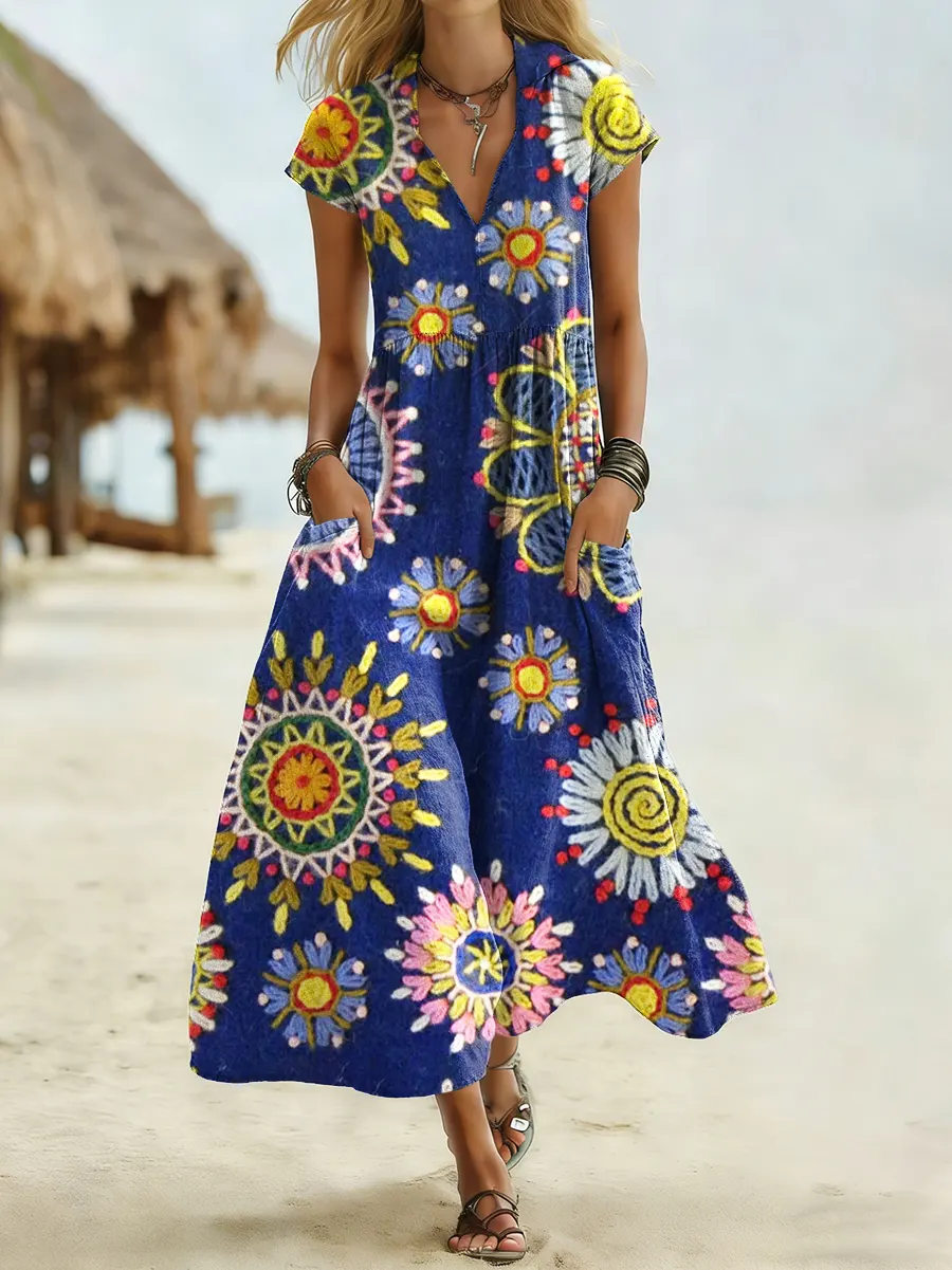 Women's Bohemian-style Long-sleeve V-neck Dress With Ethnic-inspired Artistic Print