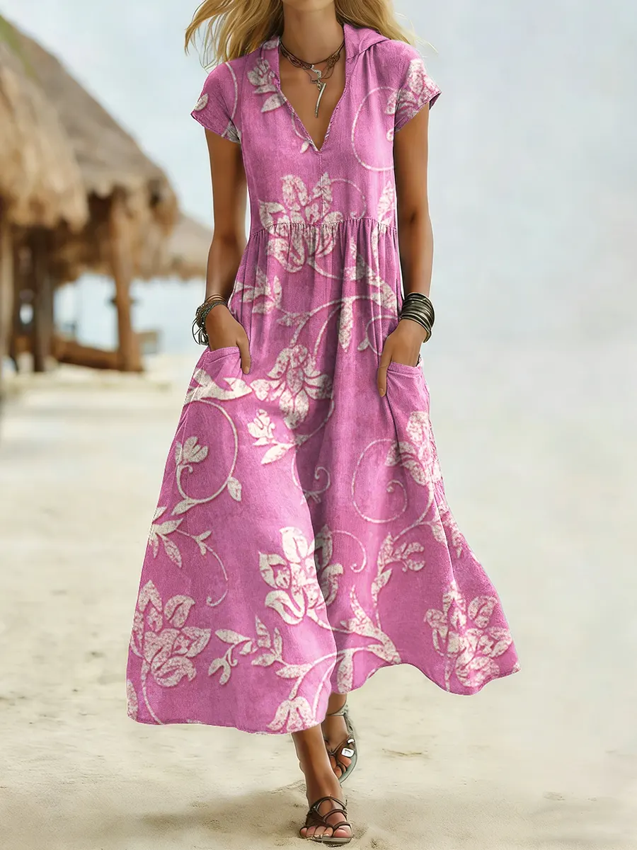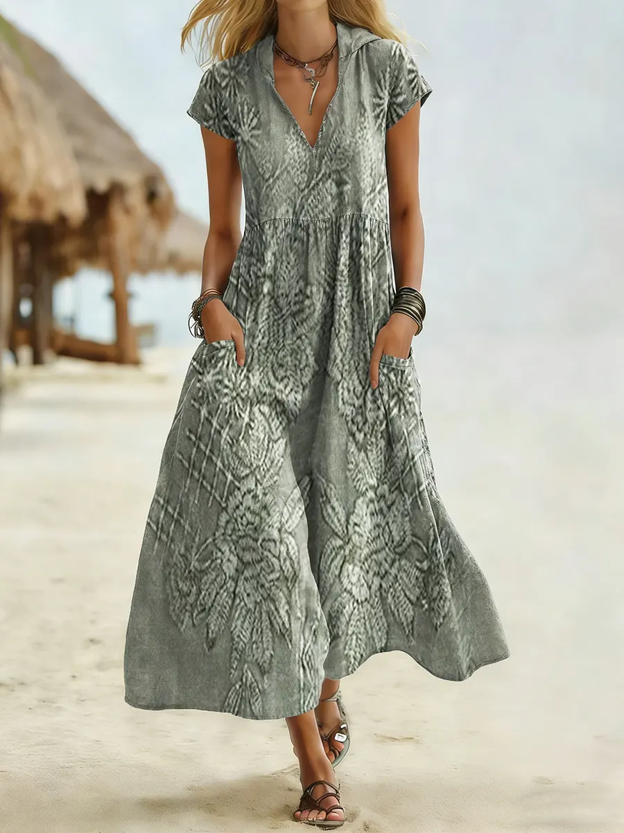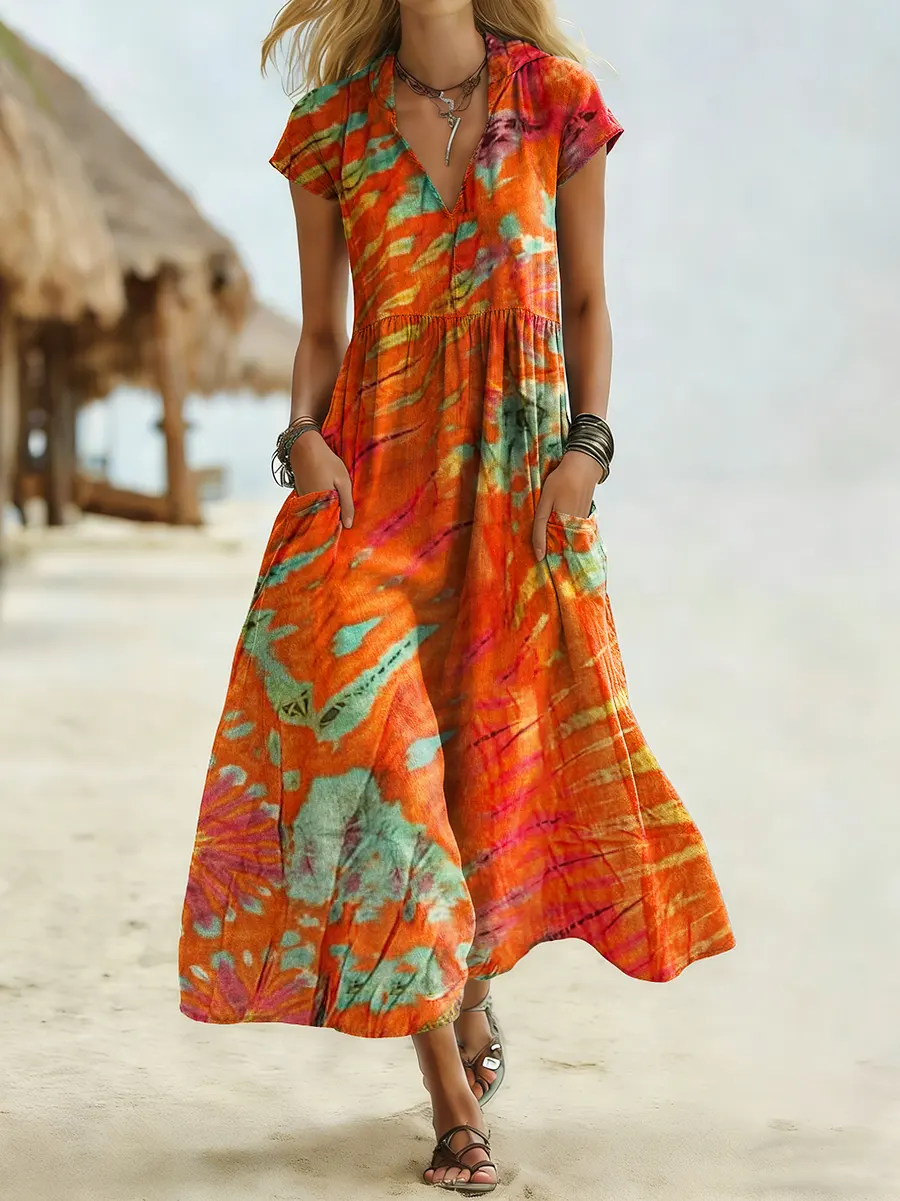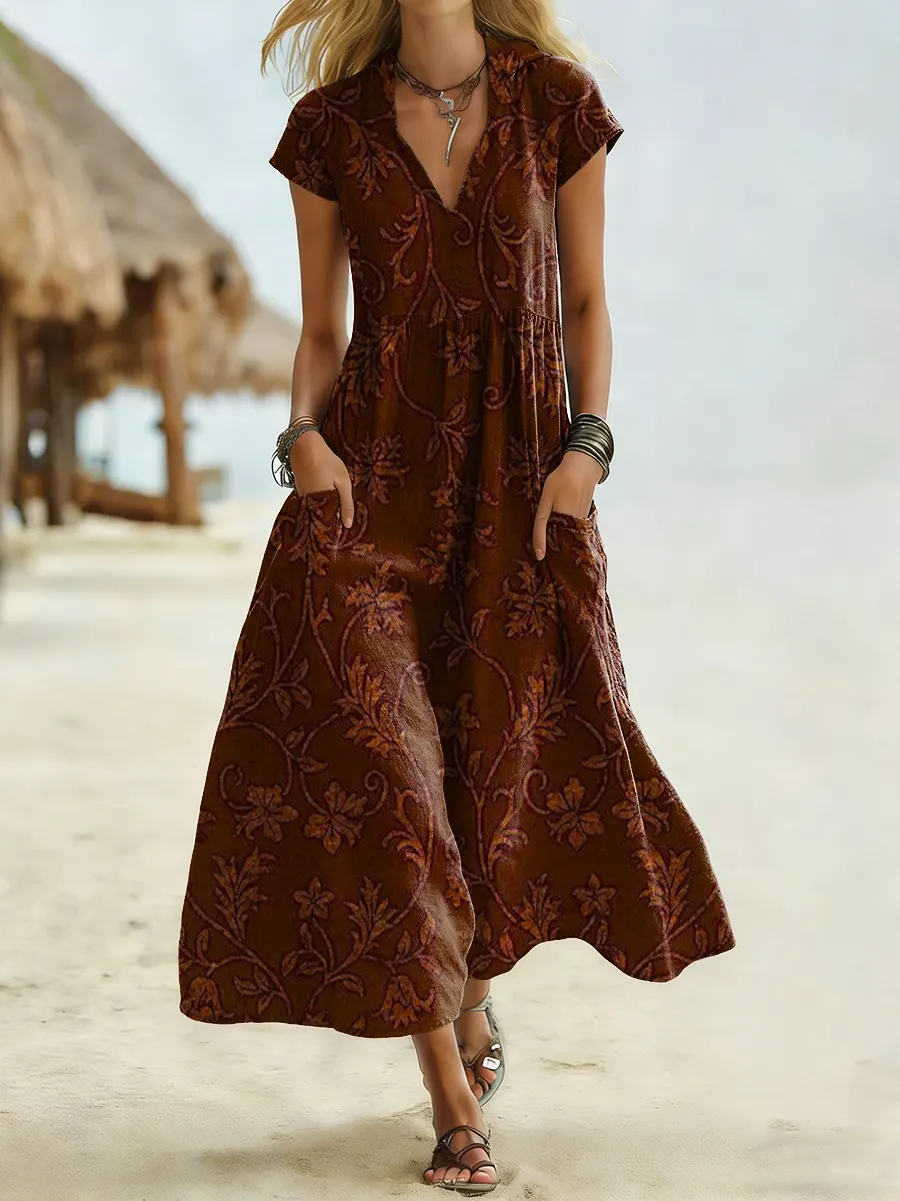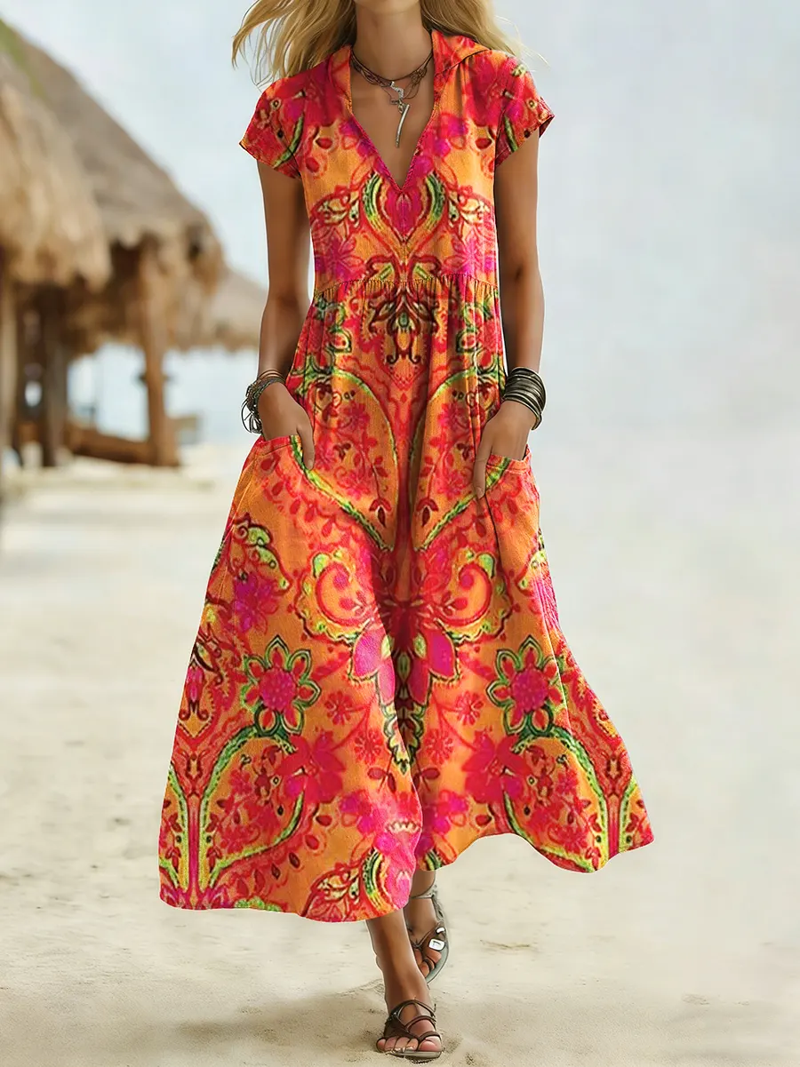 Women's Bohemian-style Long-sleeve V-neck Dress With Ethnic-inspired Artistic Print