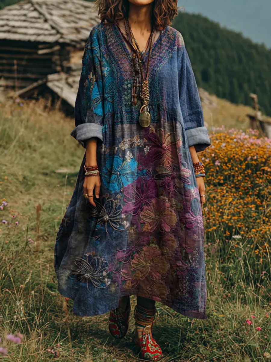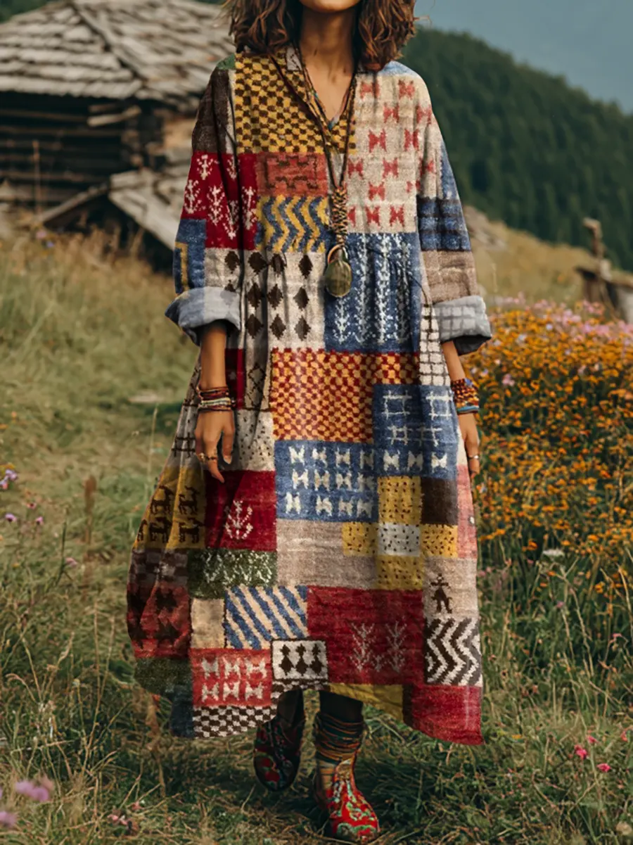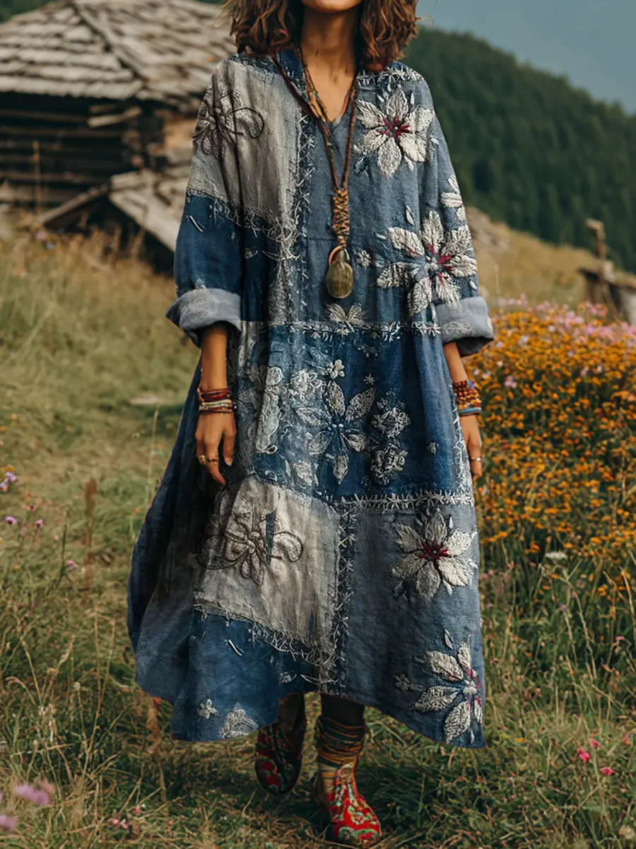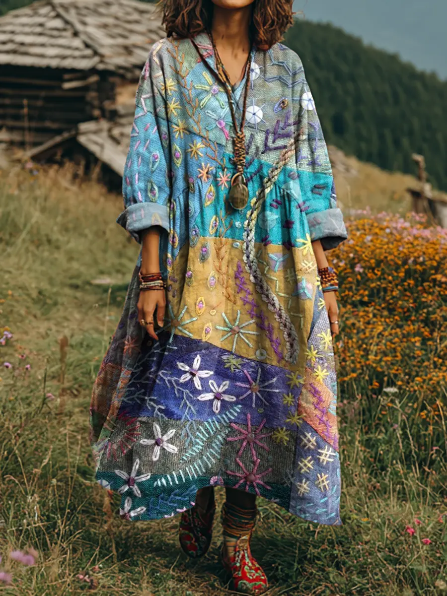 Ethnicity Bohemia Patchwork Flowers Women's Art Print Casual Long Sleeve Dress