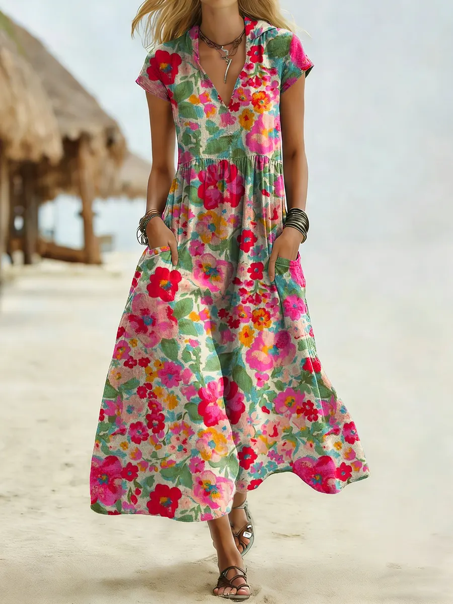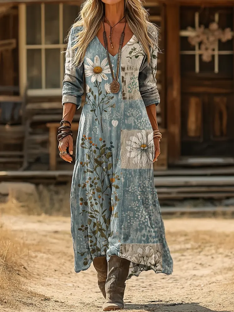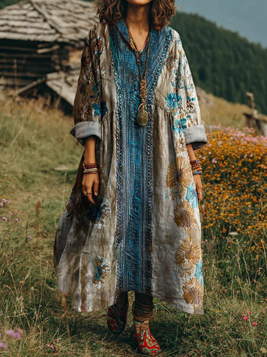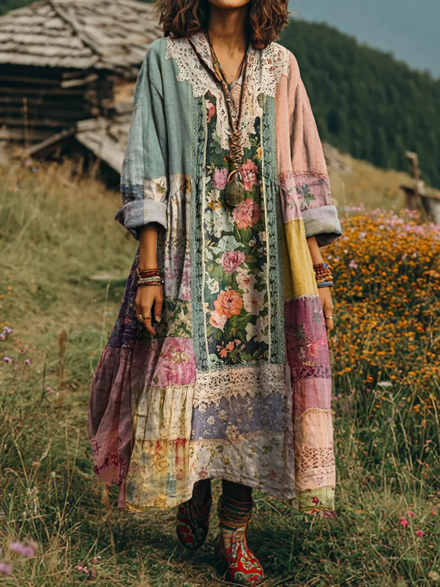 Ethnicity Bohemia Patchwork Flowers Women's Art Print Casual Long Sleeve Dress