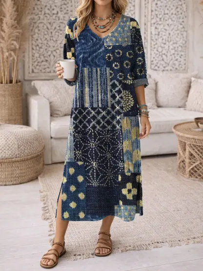 Ethnicity Blue Patchwork Flowers Women's Art Print Casual Washed Denim Cotton Dress