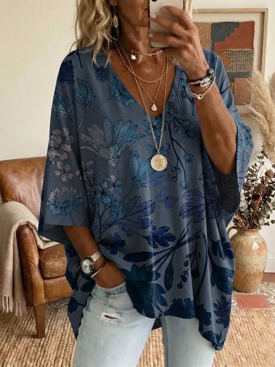 Ethnicity Flower Women's Art Print Casual V Collar Cotton Top