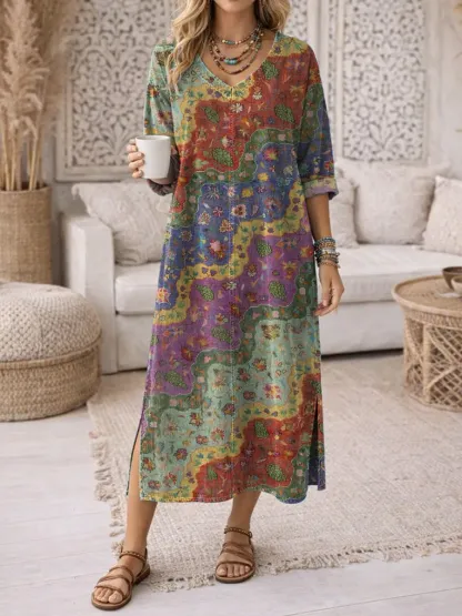 Ethnicity Flowers Arc Women's Art Print Casual Washed Denim Cotton Dress