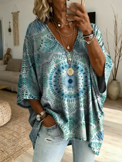 Ethnicity Light Blue Kaleidoscope Women's Art Print Casual Washed Cotton Denim Top