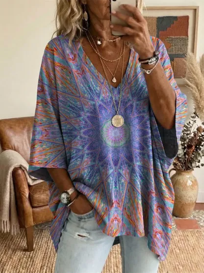 Ethnicity Retro Geometry Kaleidoscope Women's Art Print Casual V Collar Cotton Top