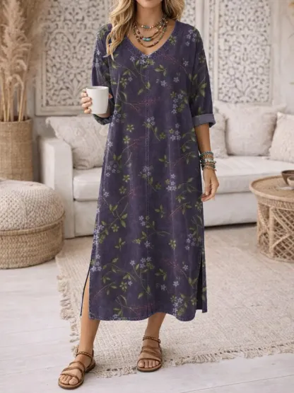 Vintage National Flower Women's Art Print Casual Washed Denim Cotton Dress