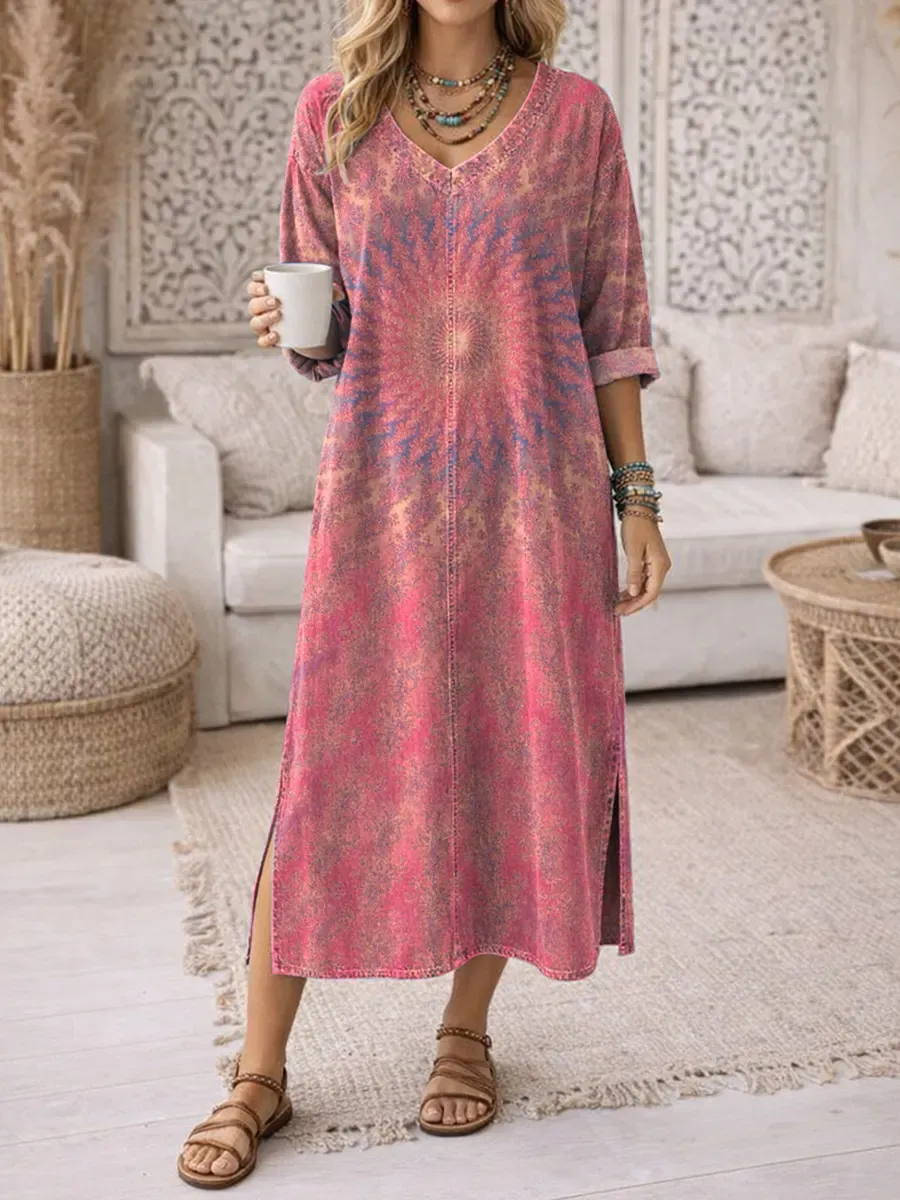 Vintage National Kaleidoscope Women's Art Print Casual Washed Denim Cotton Dress