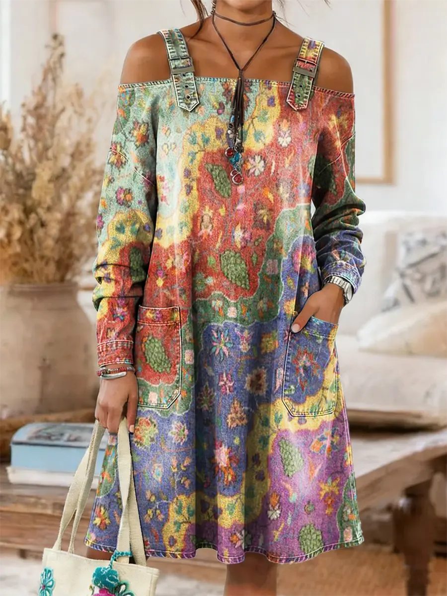 Women's Bohemian Floral Patchwork Art Print Washed Denim Cotton Off-Shoulder Dress