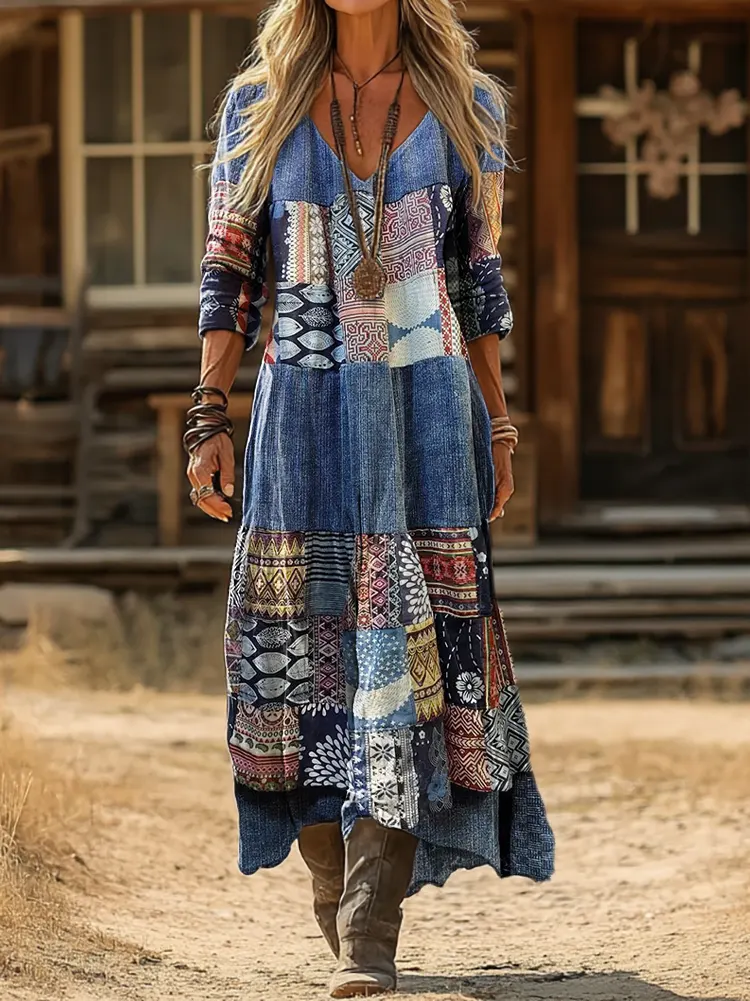 Women's Bohemian-Style Denim Patchwork Art Print Pocket Cotton Dress