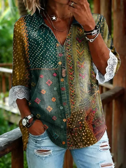 Women's Ethnic Art Print V-neck Lace-trimmed Denim Shirt