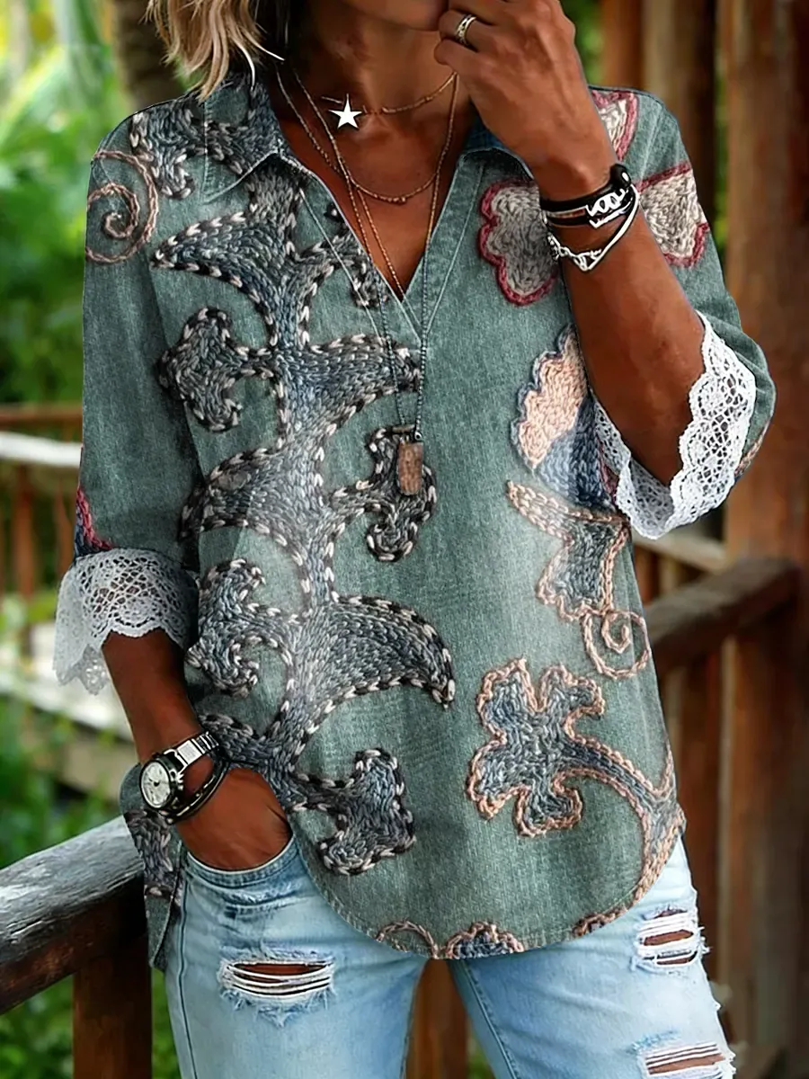 Women's Ethnic Art Print V-neck Lace-trimmed Denim Shirt