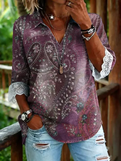 Women's Ethnic Floral Art Print V-neck Denim Shirt With Lace Trim