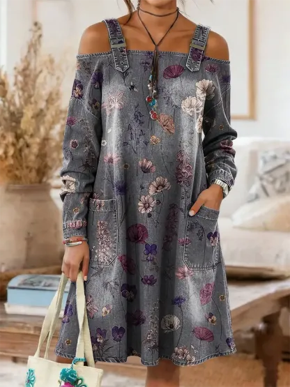 Women's Floral Art Print Washed Denim Cotton Off-Shoulder Dress