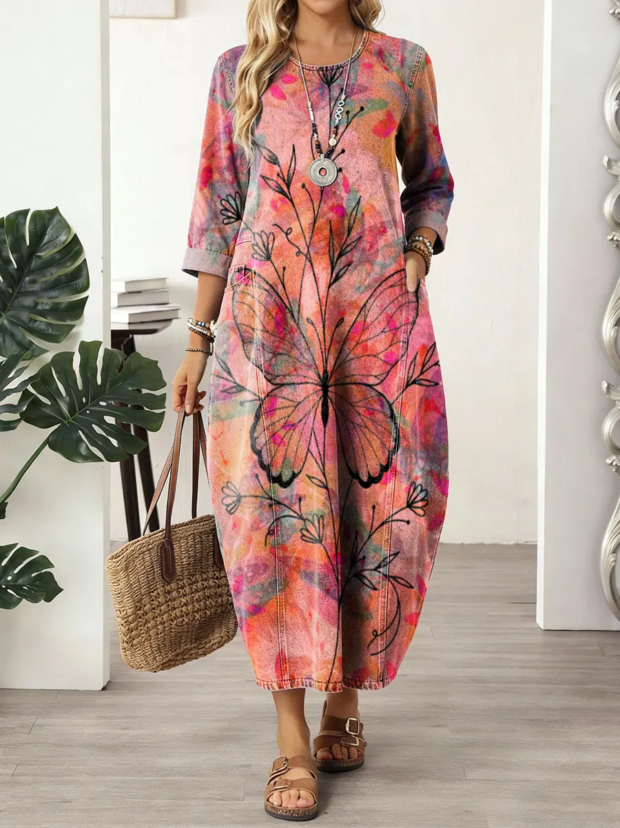 Women's Floral Butterfly Art Print Round Neck Washed Cotton Denim Dress