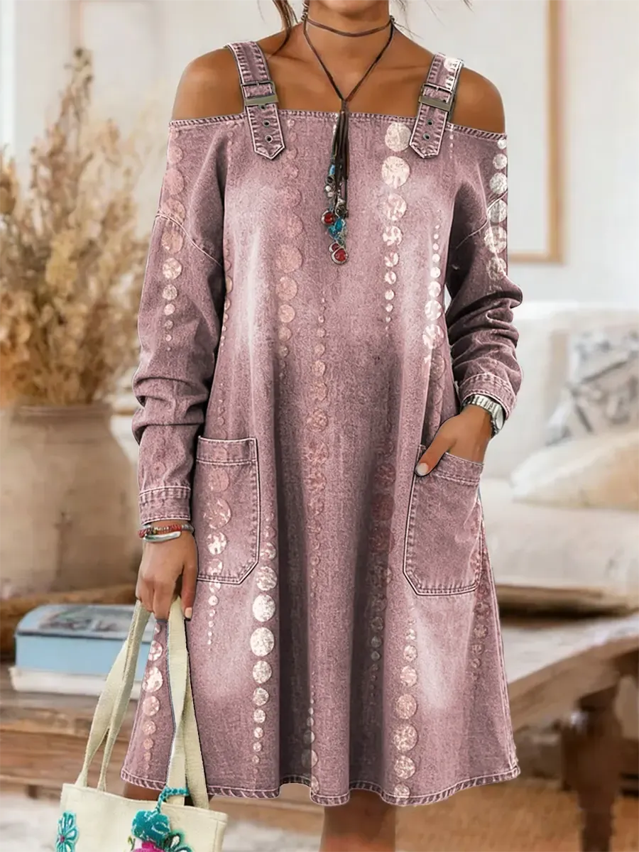 Women's Polka Dot Art Print Washed Denim Cotton Off-Shoulder Dress