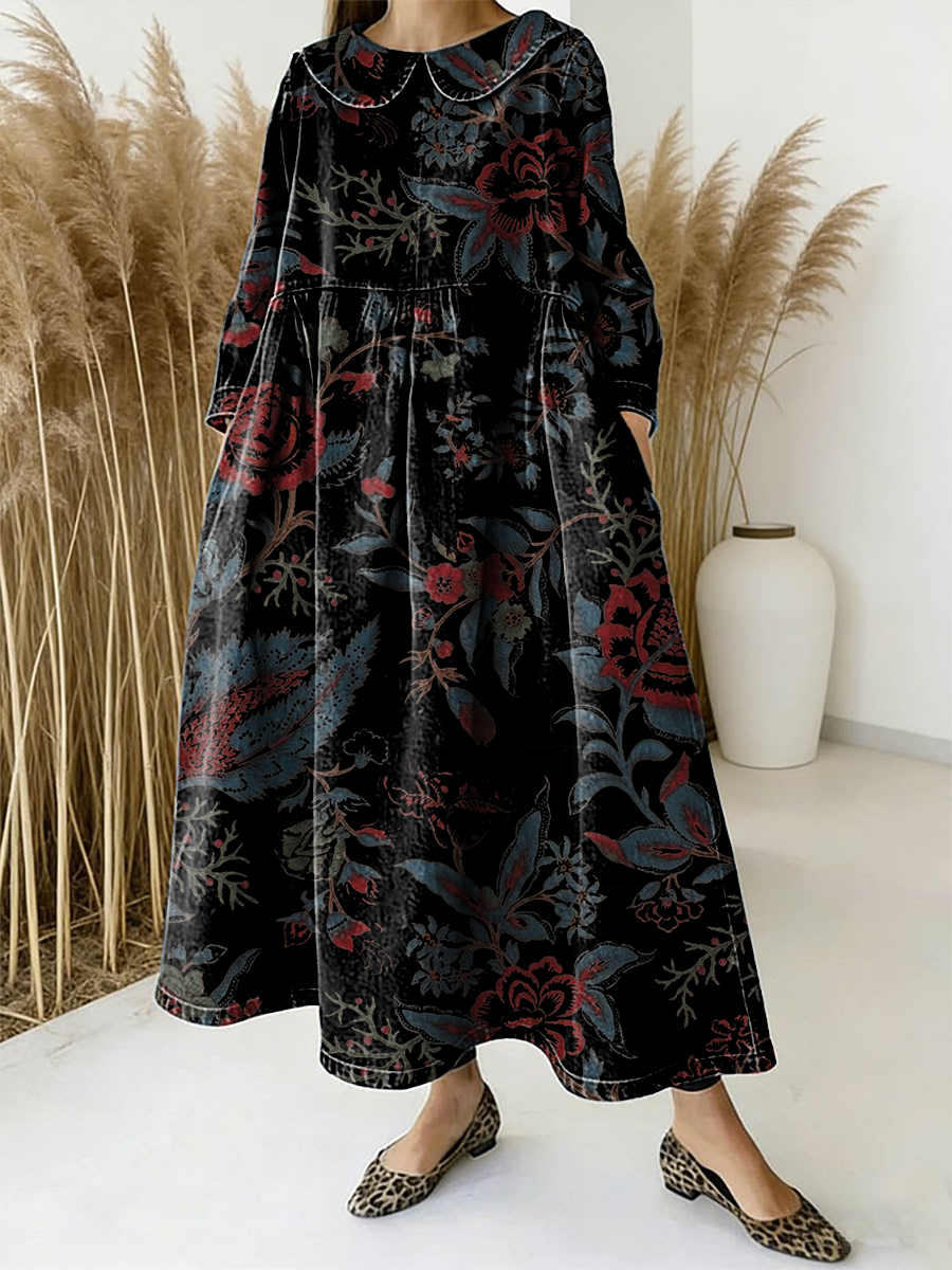 Women's Retro Bohemian Floral Art Print Casual Long-Sleeved Peter Pan Collar Washed Cotton Denim Dress