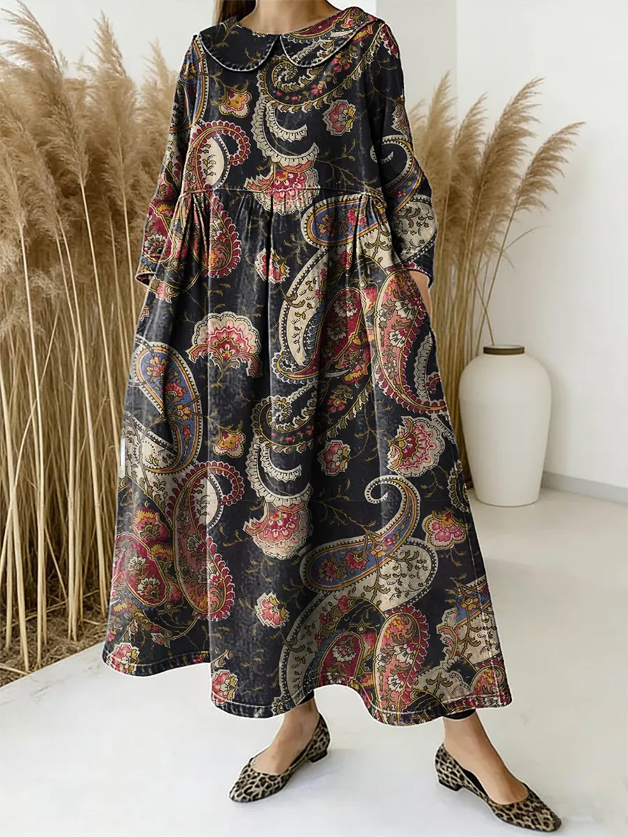 Women's Retro Bohemian Paisley Art Print Casual Long-Sleeved Peter Pan Collar Washed Cotton Denim Dress