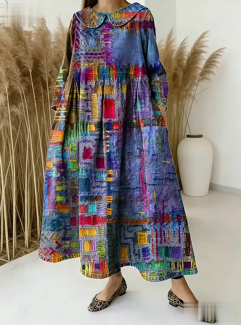 Women's Retro Colorful Art Print Casual Long Sleeve Peter Pan Collar Washed Cotton Denim Dress