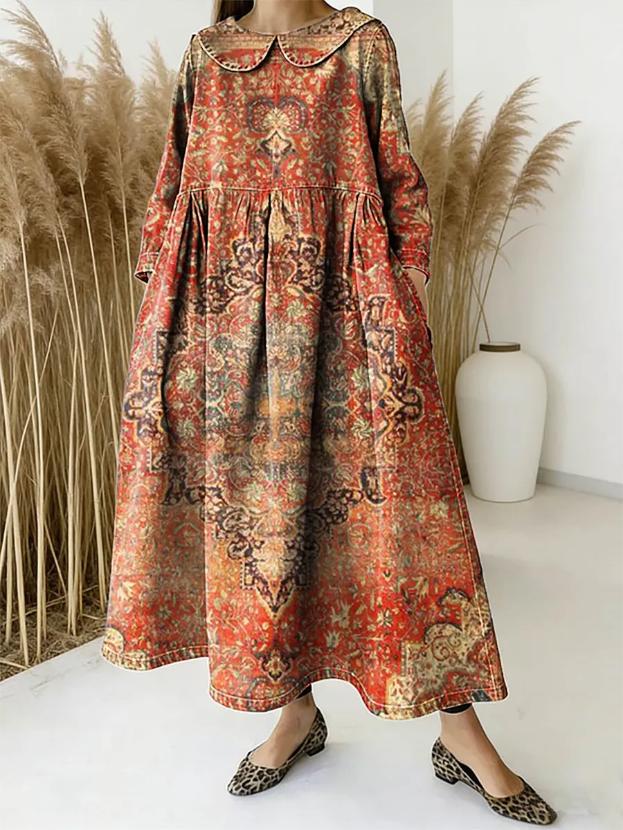Women's Retro Ethnic Totem Art Print Casual Long-Sleeved Peter Pan Collar Washed Cotton Denim Dress