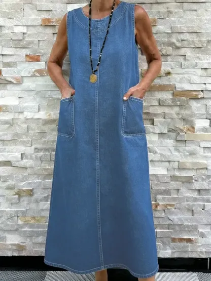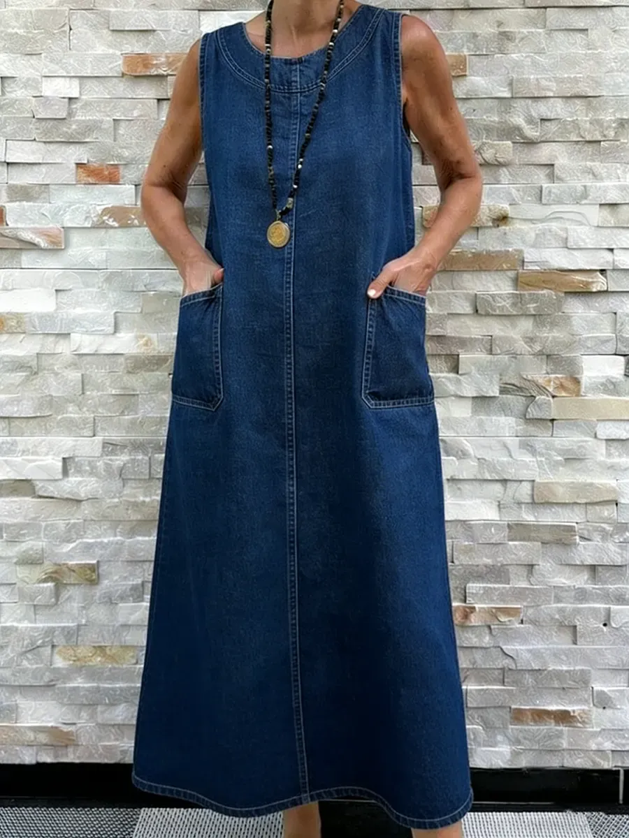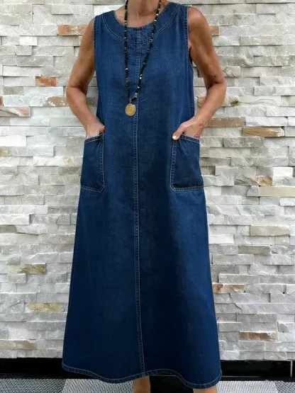Women's Round Neck Sleeveless Washed Cotton Denim Dress