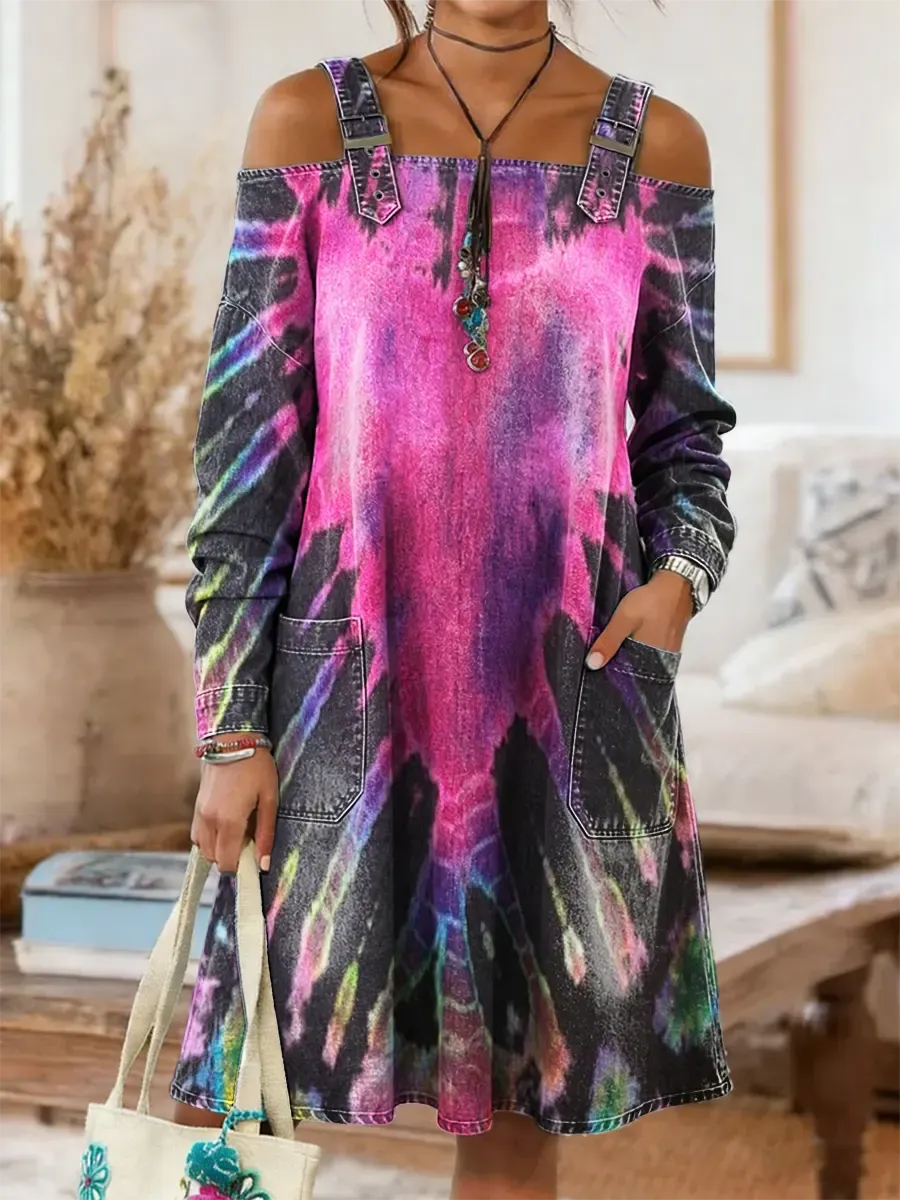 Women's Tie-Dye Heart Print Washed Denim Cotton Off-Shoulder Dress