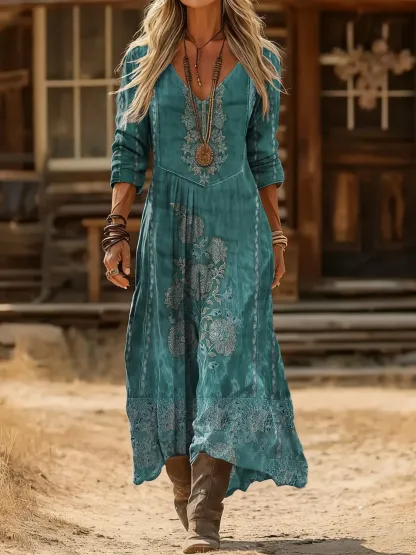 Women's Vintage Ethnic Floral Print Cotton Dress With Pockets