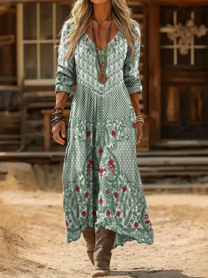 Women's Vintage Ethnic Floral Print Cotton Dress With Pockets