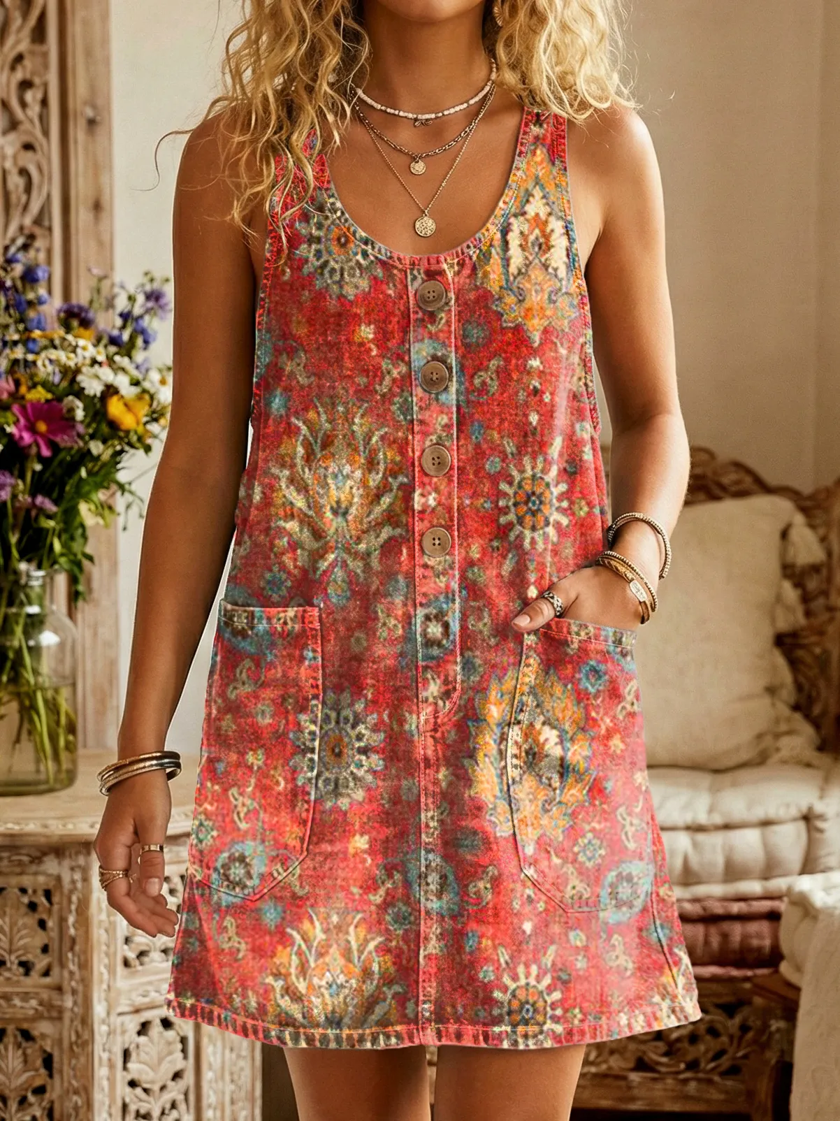 Women's Vintage Ethnic Red Floral Art Printed Casual Button Denim Dresses