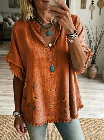 Women's Vintage Floral Art Print Casual Loose V-Neck T-Shirt