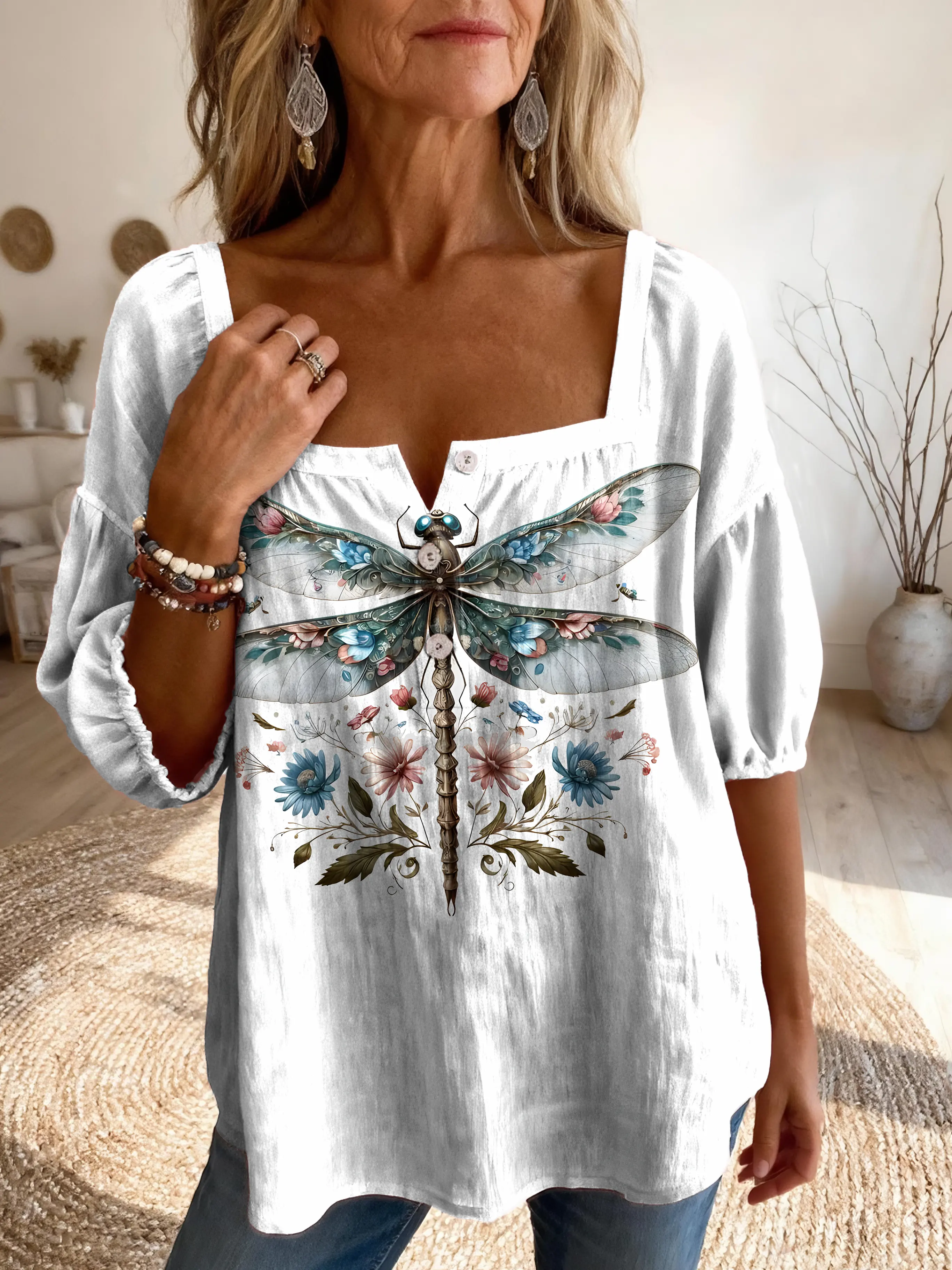 Ethnicity Flowers Dragonfly Women's Vintage Art Print Casual Square-neck Top