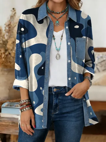 Ethnicity Geometry Color Blocks Women's Print Casual Denim Patchwork Cotton Shirt