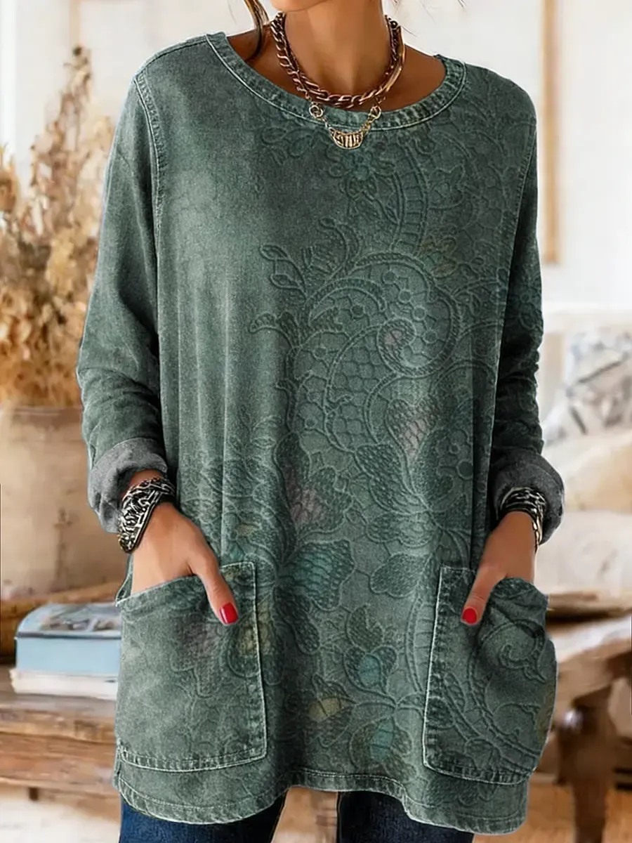 Ethnicity Geometry Texture Totem Women's Casual Long-sleeve Crew Neck Pocket Washed Cotton Denim T-shirt