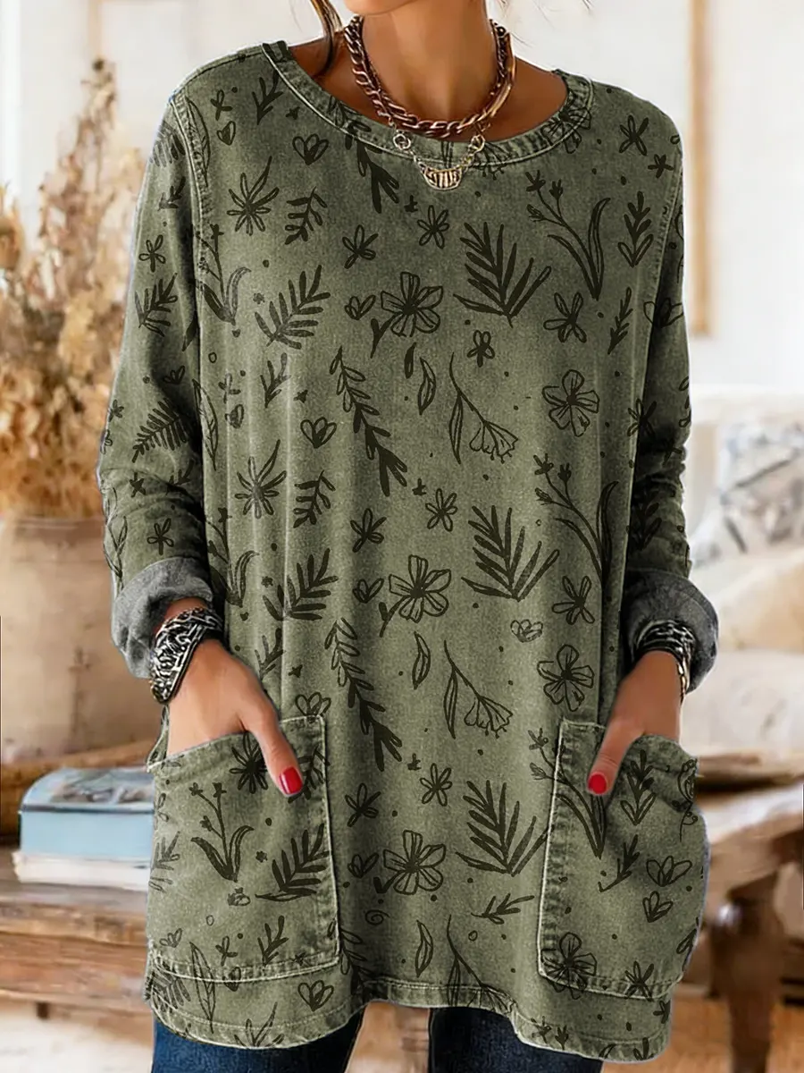 Ethnicity Green Flowers Leaves Women's Casual Long-sleeve Crew Neck Pocket Washed Cotton Denim T-shirt