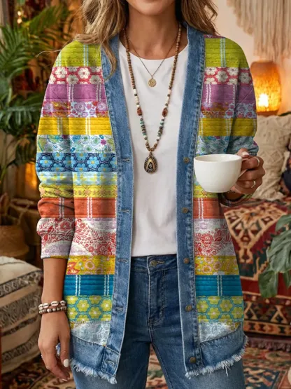 Ethnicity Patchwork Geometry Totem Women's Art Print Casual Long Sleeve Denim Patchwork Shirt Coat