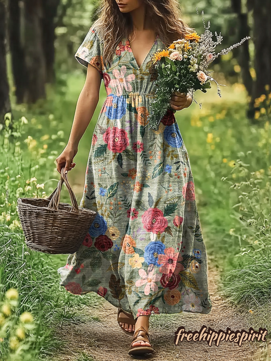 Floral Print Artistic Pocket Cotton Women's Dress