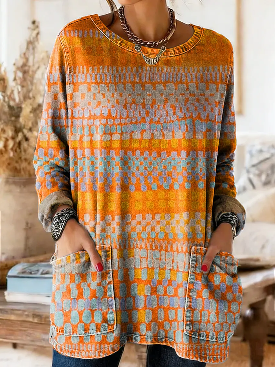 National Geometry Women's Casual Long-sleeve Crew Neck Pocket Washed Cotton Denim T-shirt