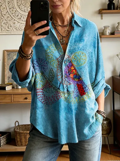 Women's Art Print Casual Long-sleeve Shirt With Bird Motif