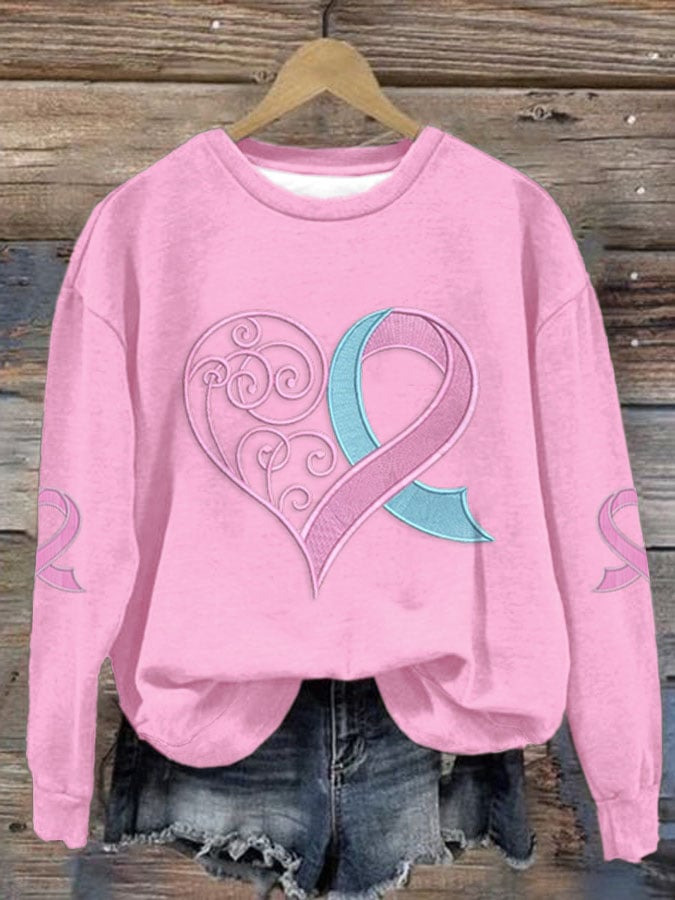 Women's Breast Cancer Awareness Print Love Heart Pink Ribbon Long Sleeve Sweatshirt