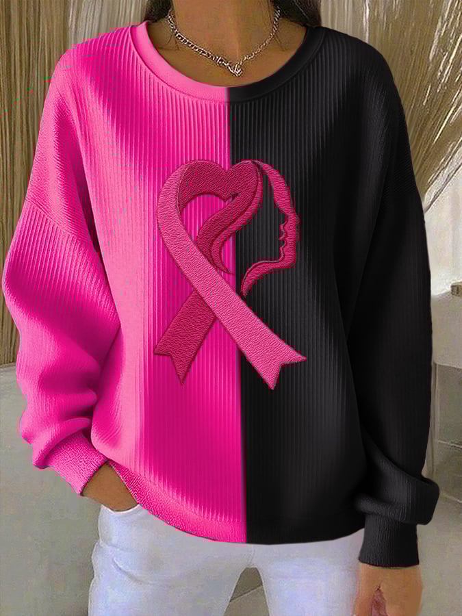 Women's Casual Contrast Pink Heart Ribbon Hoodie Textured Sweatshirt