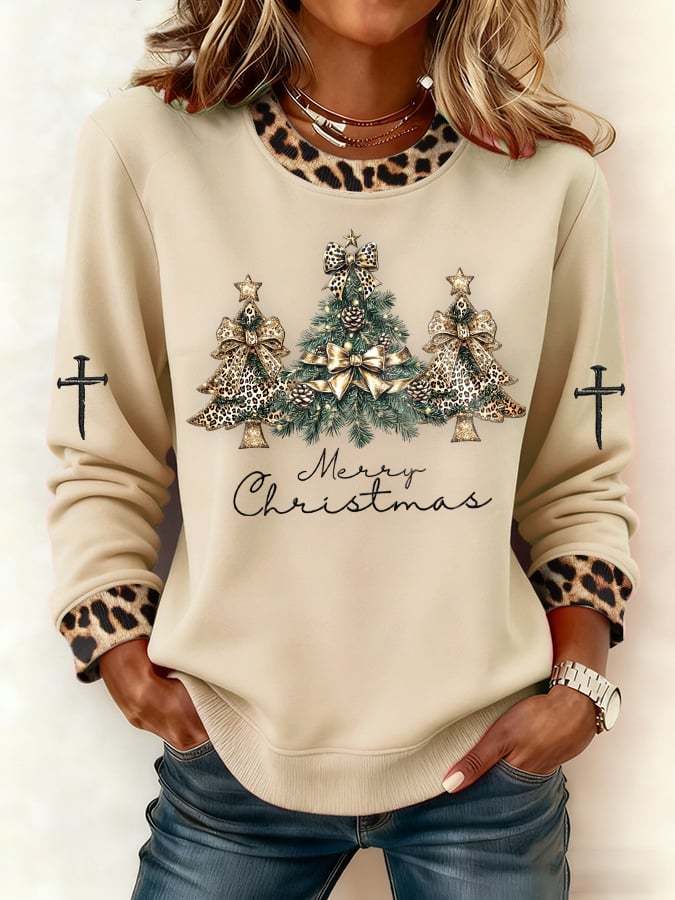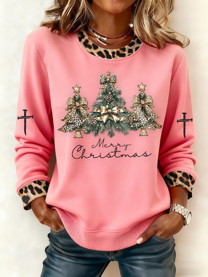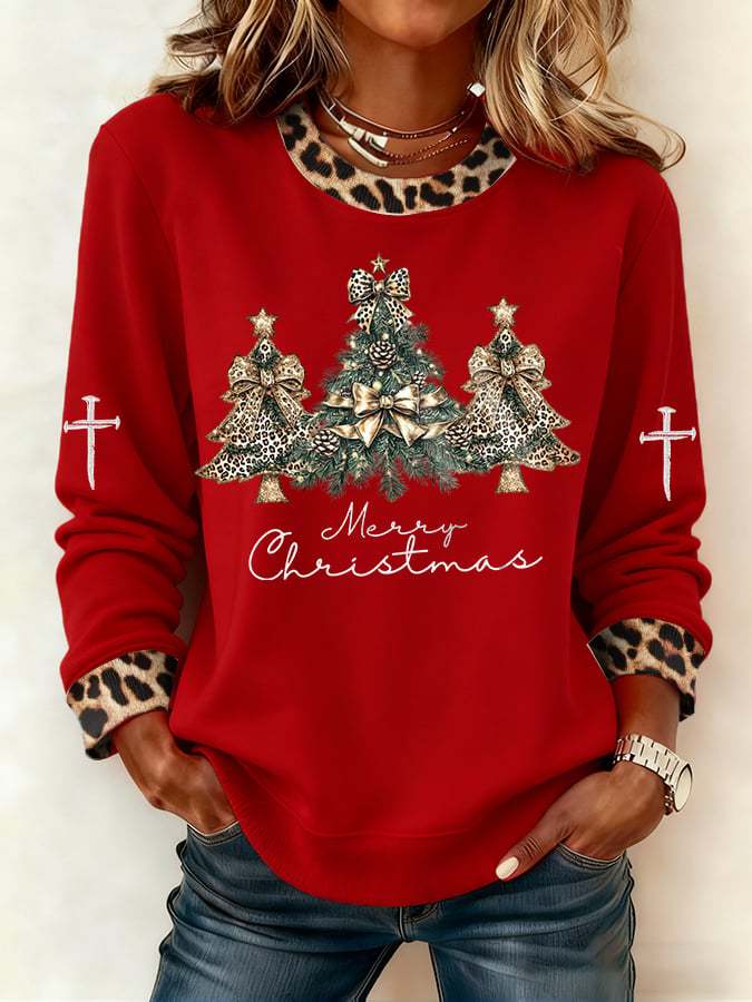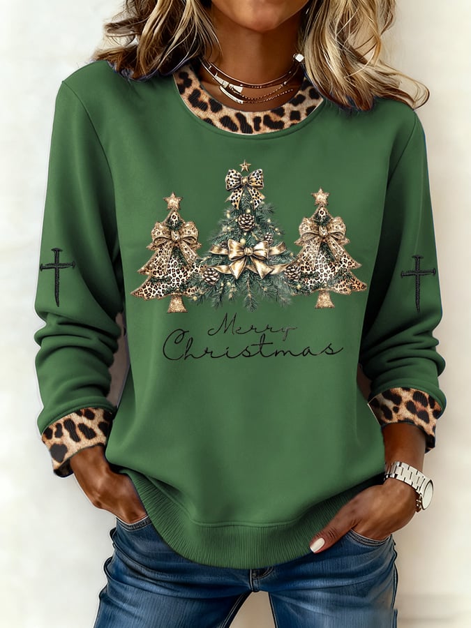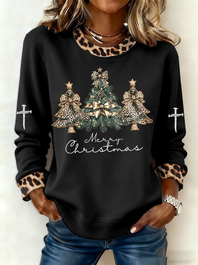 Women's Casual Leopard Print Christmas Tree Sweatshirt