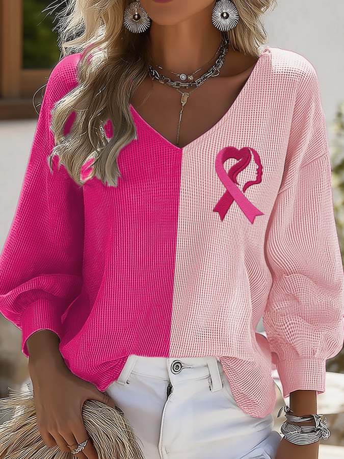 Women's Casual Pink Ribbon Waffle Puff Sleeve V-Neck Long-Sleeved Top