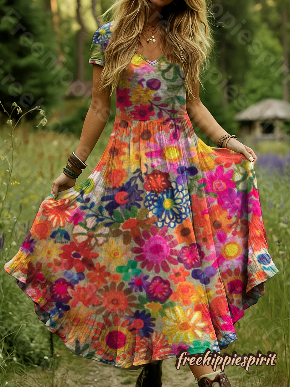 Women's Colorful Bohemian Floral Art Print Pocket Cotton Dress