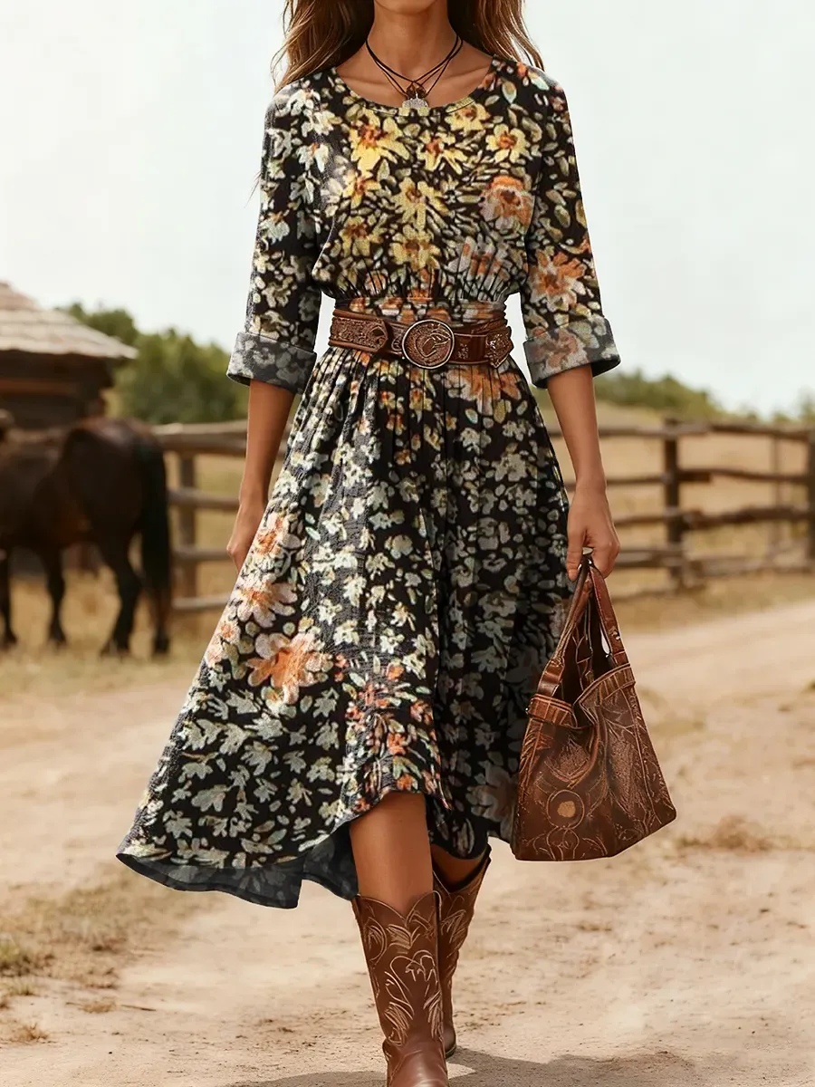 Women's Ethnic Floral Art Print Round Neck Cotton Linen Pocket Dress