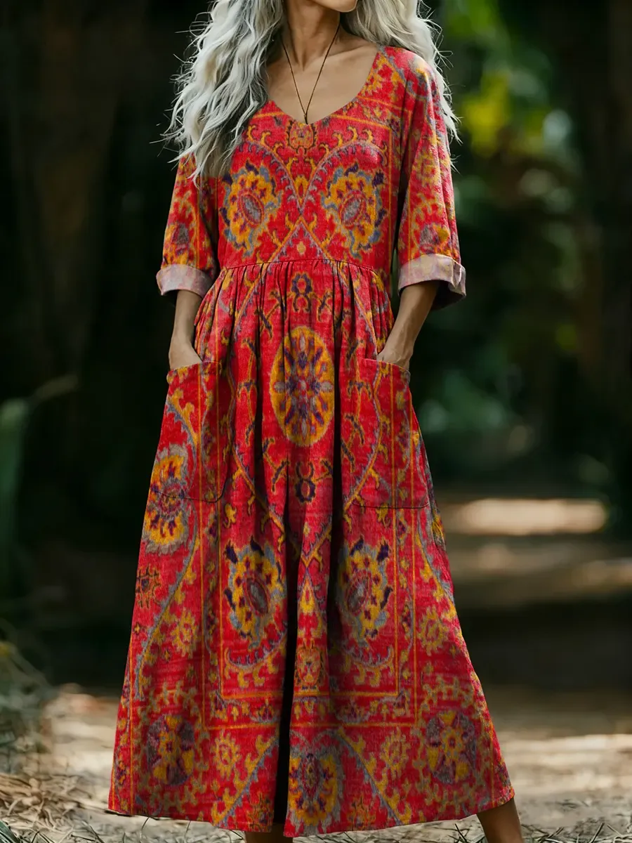 Women's Ethnic Totem Art Pattern Prints Round Neck Cotton Linen Pocket Dress