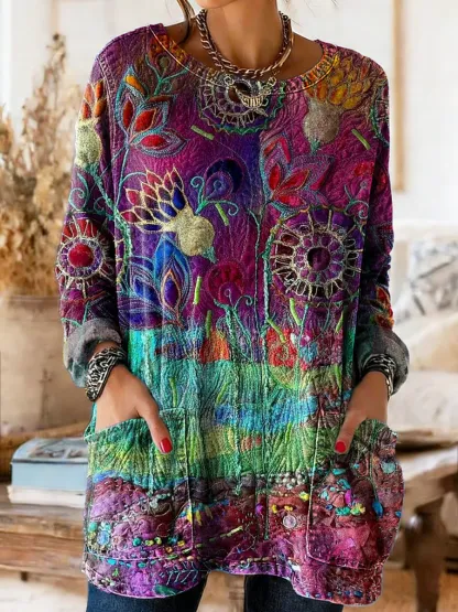 Women's Retro Floral Art Print Casual Long-Sleeve Round Neck Pocket Washed Cotton Denim T-Shirt