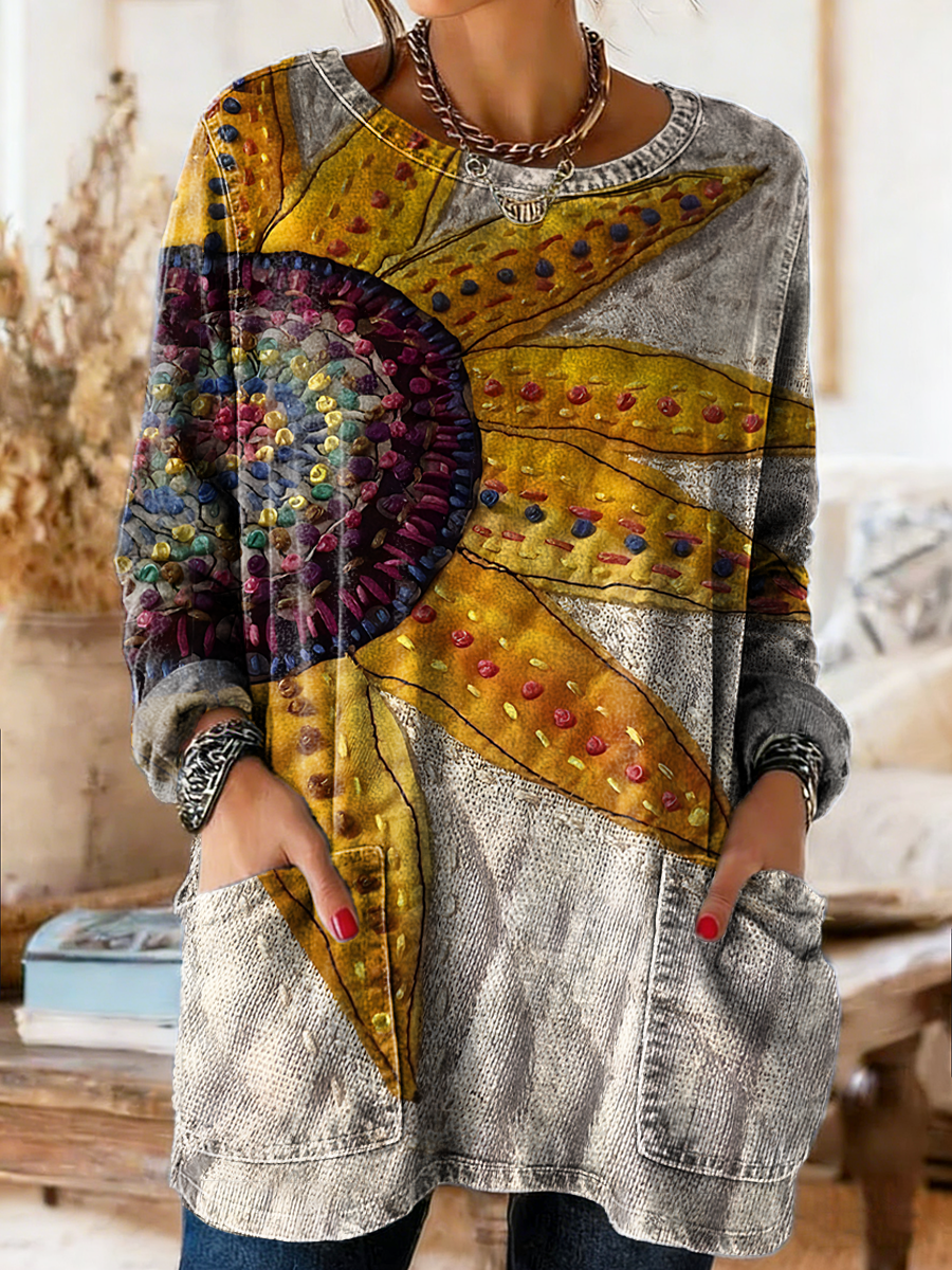 Women's Retro Floral Art Print Casual Long-Sleeve Round Neck Pocket Washed Cotton Denim T-Shirt