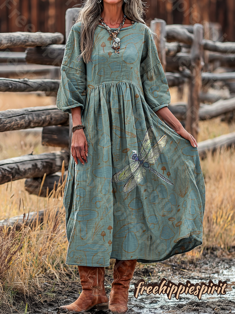 Women's Vintage Green Dragonfly Mushroom Hippie Art Print Flowing Elegant Cotton Crew Neck Dress
