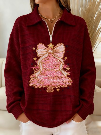 Women's Winter Pink Christmas Tree Print Waffle Lapel Top