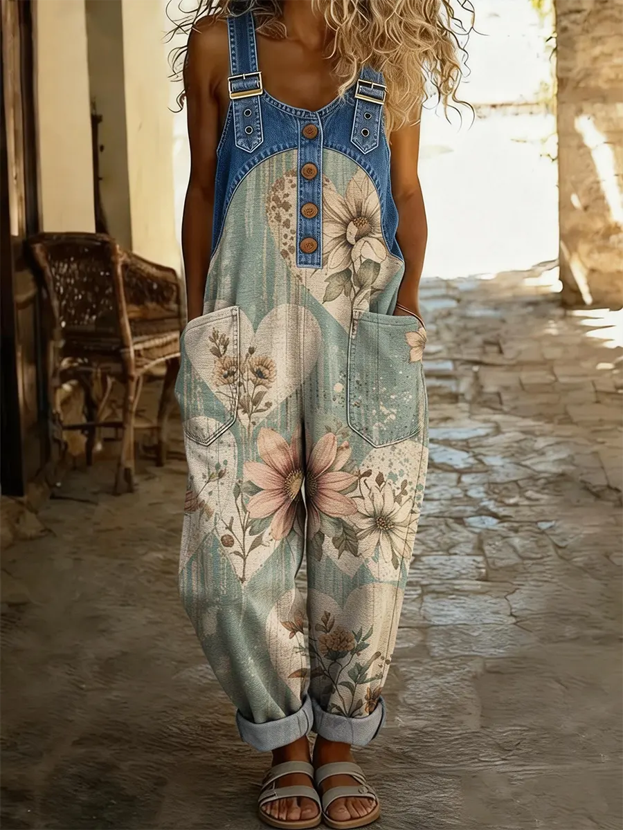 Ethnicity Bohemia Floral Love Women's Casual Washed Cotton Denim Patchwork Jumpsuit
